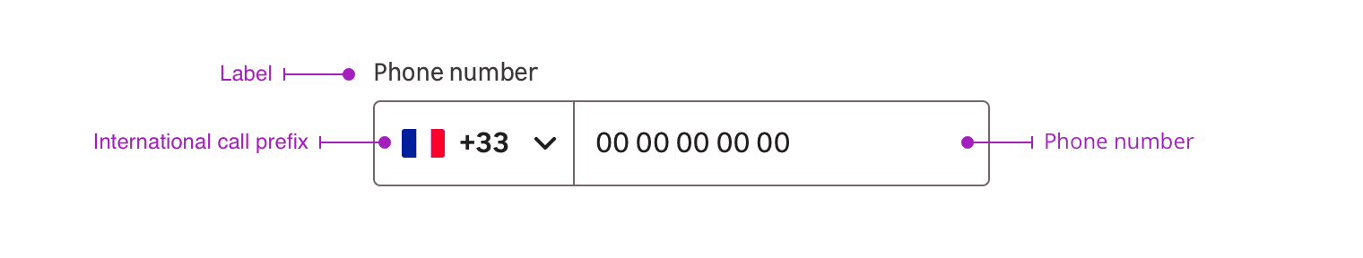 - Dropdown with a flag and an international country prefix