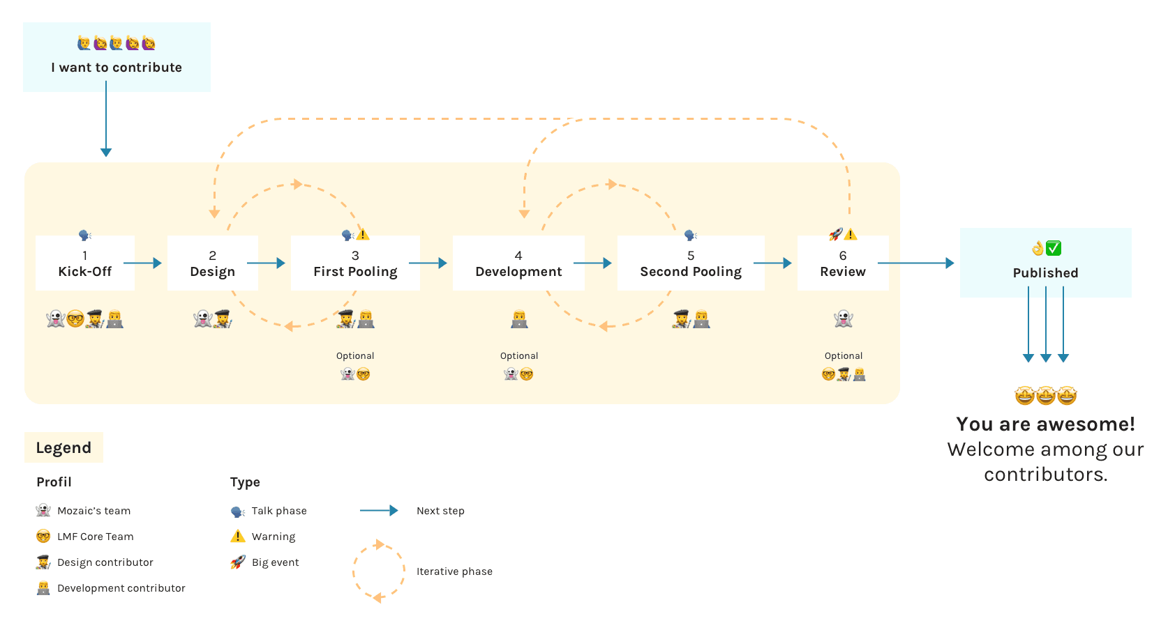 Mozaic is a design system that wants to make designers and developers collaboration easy. By contributing to Mozaic, you become an actor of this project and can create the elements you need, without necessarily waiting for them to be made available to you by the Mozaic team.